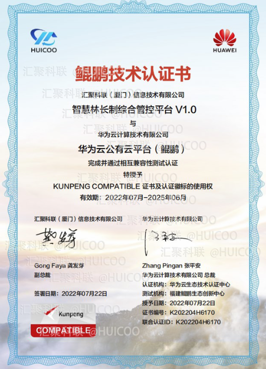 匯聚科聯(lián)自主研發(fā)的“智慧林長(zhǎng)制綜合管控平臺(tái)1.0”與華為云計(jì)算技術(shù)有限公司的華為云公有云平臺(tái)(鯤鵬)完成并通過(guò)相互兼容性測(cè)試認(rèn)證,正式獲得華為鯤鵬技術(shù)認(rèn)證書(shū)